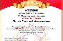 Ученик 8б класса нашей школы Петин Савелий(руководитель Шакиров И.А.) награждён Дипломом I степени IV Международного конкурса "Гордость страны" . Поздравляем!