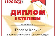 Ученица 5 класса нашей школы Гараева Карина награждена Дипломом I степени регионального конкурса "Я рисую ПОБЕДУ" в номинации "История большой победы".
