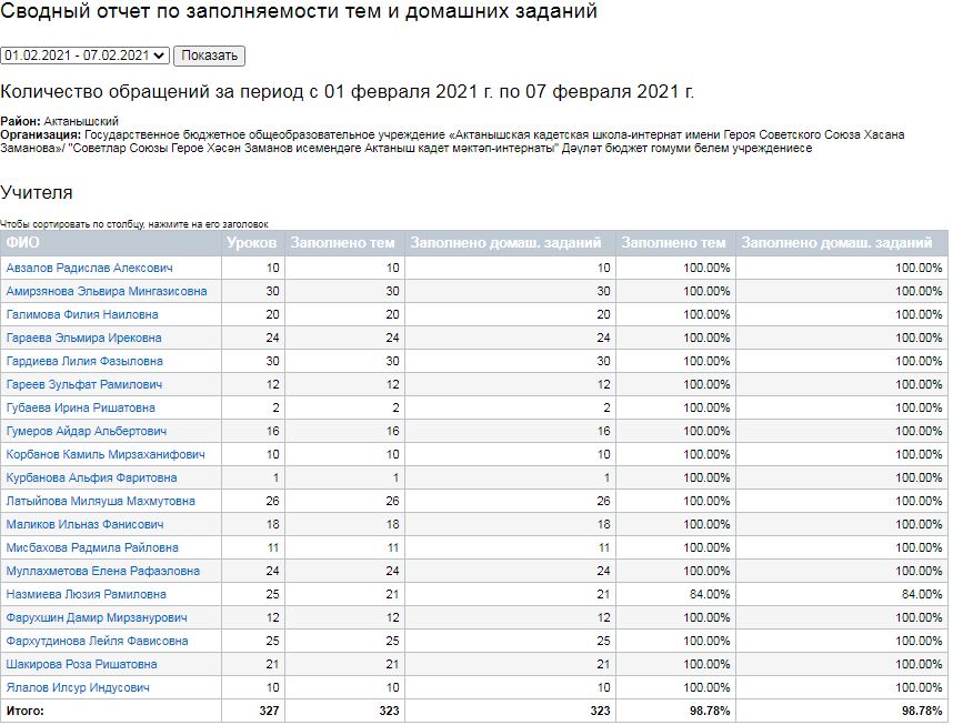 Сводный отчет по заполняемости тем и домашних заданий (01-07.02.2021)
