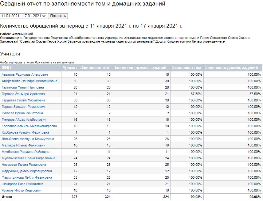 Сводный отчет по заполняемости тем и домашних заданий (11-17.01.2021)