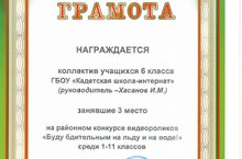 Учащиеся 6 класса нашей школы(руководитель воспитатель 6 класса Хасанов И.М.) заняли 3 место на районном конкурсе видеороликов "Буду бдительным на льду и на воде!" среди 1-11 классов. Поздравляем!