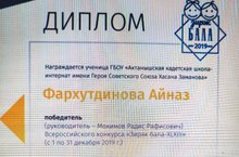 Ученица 11 класса нашей школы Фархутдинова Айназ(руководитель воспитатель Мокимов Р.Р.) награждена Дипломом Всероссийского конкурса "Зирэк бала - XLXIII" в номинации "Моя семья - моя гордость, наши традиции". Поздравляем и желаем дальнейших успехов!
