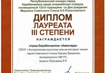21 декабря 2019 года на базе ГБОУ «Татарстанский кадетский корпус Приволжского федерального округа имени Героя Советского Союза Гани Сафиуллина» г.Нижнекамск состоялся республиканский конкурс-парад барабанщиков среди юнармейских отрядов, где отряд барабанщиков "Авангард" нашей школы занял III место в республиканском конкурсе-параде барабанщиков среди юнармейских отрядов, награжден Дипломом лауреата III степени и кубком. Руководитель барабанщиков Искужина Р.Р.