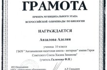 Ученица 10 класса нашей школы Авзалова А.(учитель биологии Галимова Ф.Н.) стала призёром муниципального этапа Всероссийской предметной олимпиады по биологии. Поздравляем и желаем дальнейших успехов!