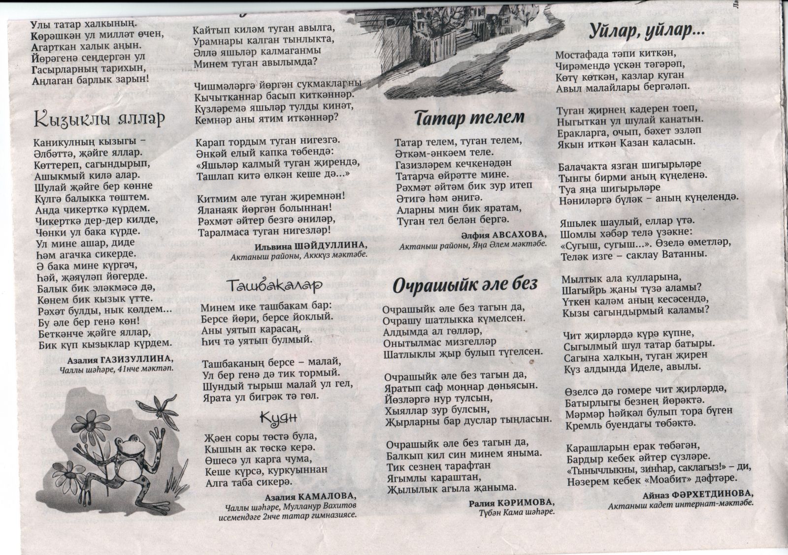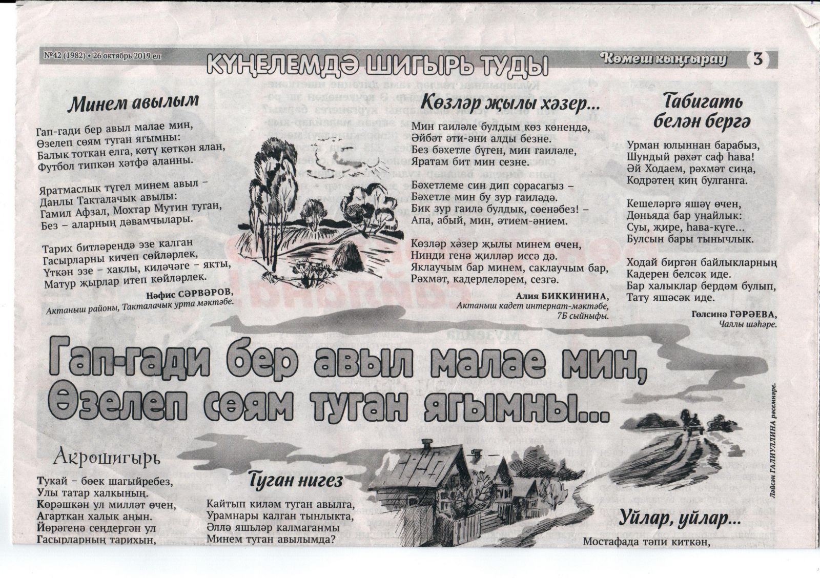 Опубликованы статьи "Көзләр җылы хәзер..." ученицы 7б класса нашей школы Биккининой Алии , "Уйлар, уйлар..." ученицы 11 класса Фархутдиновой Айназ и "Әнием" ученика 7б класса Набиева Эльмира (руководитель Фархутдинова Л.Ф.) в Республиканской газете "Көмеш кыңгырау", №42, (26.10.2019).