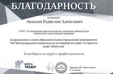 Учитель истории Авзалов Р.А. награждён Благодарственным письмом.