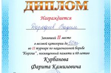 26 января в г.Азнакаево прошёл II турнир по нац.борьбе "Көрәш", посвящённый памяти и 60-летию Ф.К.Курбанова. Ученик 9А класса нашей школы Дорофеев В. в турнире занял второе место в весовой категории до 50 кг. и награждён грамотой, медалью, денежным призом на сумму 1500 рублей. Поздравляем и желаем дальнейших успехов!