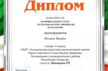 Поздравляем победителя муниципального этапа Всероссийской предметной олимпиады по геологии ученика 9б класса нашей школыИсанова В.(учитель географии Шакирова Р.Р.)