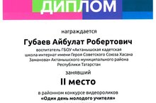 Воспитатель 6б класса нашей школы Губаев А.Р. занял II место в районном конкурсе видеороликов "Один день молодого учителя" в номинации "Я сам себе режиссер" и награждён ДИПЛОМОМ. Поздравляем!