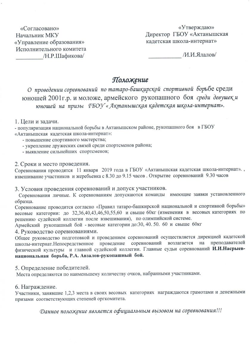 11 января на базе нашей школы состоятся соревнования по татаро-башкирской спортивной борьбе среди юношей 2001 г.р. и моложе, армейского рукопашного боя среди девушек и юношей на призы ГБОУ "Актанышская КШИ".
