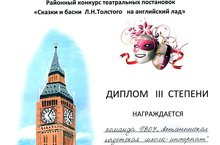 Команда (5б класс) нашей школы стала призёром в районном конкурсе театральных постановок "Сказки и басни Л.Н.Толстого на английский лад" и награждена Дипломом III степени. Руководитель команды Гардиева Л.Ф. Поздравляем и желаем дальнейших успехов!