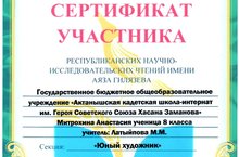 Ученица 8б класса нашей школы Митрохина Анастасия(руководитель Латыйпова М.М.) приняла участие в Республиканском научно-исследовательском чтении имени Аяза Гилязева в секции "Юный художник" и получила сертификат участницы.