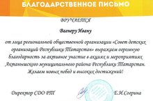 Вагнеру Ивану вручено благодарственное письмо от региональной общественной организации "Совет детских организаций РТ" за активное участие в акциях и мероприятиях Актанышского муниципального района РТ. Желаем новых побед и высоких дистижений!