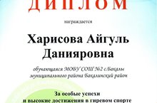 Ученица 9 класса нашей школы Харисова Айгуль награждена Дипломом за особые успехи и высокие достижения в гиревом спорте, грантом на сумму 2000 рублей. Поздравляем м желаем дальнейших успехов!