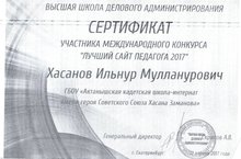 Воспитатель 7а класса Хасанов Ильнур участвовал в Международном конкурсе "Лучший сайт педагога 2017" и получил сертификат участника.