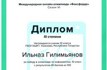 Ученик 10 класса нашей школы Гилимьянов Ильназ награждён Дипломами III степени за победу в Международной онлайн-олимпиаде "Фоксфорда" по информатике и математике. Поздравляем!