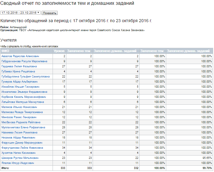 Итого: заполнение тем 100%, домашних заданий 99,70%.