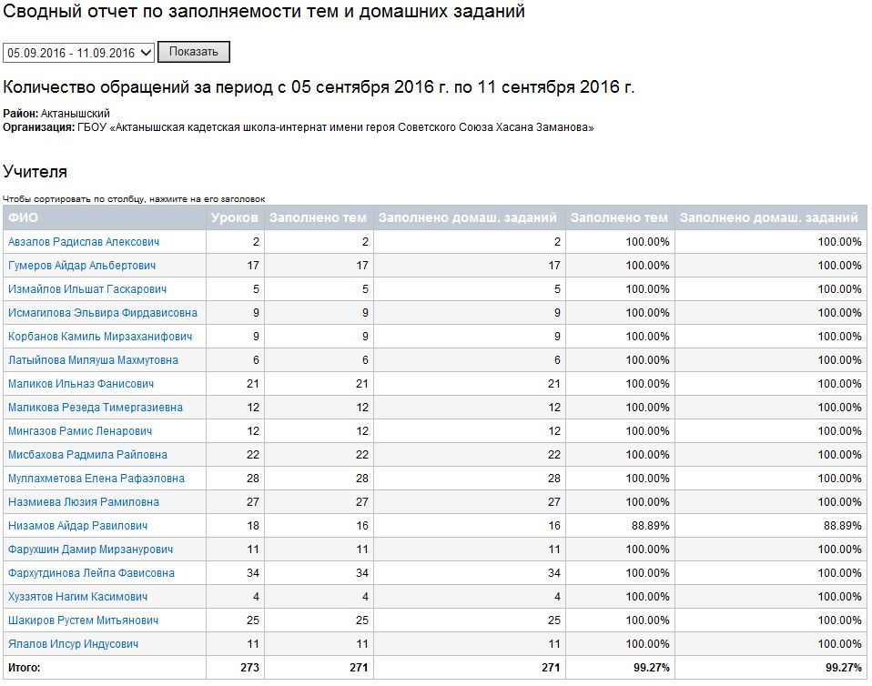 Сводный отчет по заполняемости тем и домашних заданий (05.09.2016-10.09.2016)
