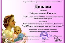 Ученица 5 класса Габдрахманова Рамиля(воспитатель Курбанова А.Ф.) стала победителем Всероссийского конкурса, посвященного Дню матери "МАМА... Как много значит это слово!" в номинации интеллектуальная викторина и награждена Дипломом I степени. Воспитатель Курбанова А.Ф. награждена благодарностным письмом. Поздравляем!