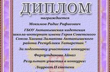 Ученица 7 класса Фархутдинова Айназ(воспитатель Мокимов Р.Р.) стала лауреатом II степени в Международном творческом конкурсе "Победилкин" и награждена Дипломом. Воспитатель Мокимов Р.Р. награжден Дипломом за подготовку участника конкурса.