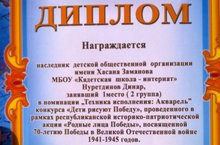 Ученик 6 класса ГБОУ "Актанышская кадетская школа-интернат" Нуретдинов Динар (руководитель учитель истории Мухаметзянова А.А.) занял I место в номинации "Техника исполнения:Акварель" конкурса "Дети рисуют Победу", проведенного в рамках республиканской историко-патриотической акции "Родные лица Победы", посвященной 70-летию Победы в Великой Отечественной войне 1941-1945 годов и награжден Дипломом I степени. Поздравляем!