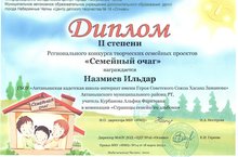 Дипломом II степени Регионального конкурса творческих семейных проектов "Семейный очаг" награжден ученик 11 класса ГБОУ "Актанышская КШИ" Назмиев Ильдар в номинации "Страницы семейного альбома". Руководитель Курбанова А.Ф. Поздравляем и желаем дальнейших побед!