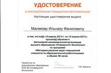 С 6 по 10 апреля 2015 года учитель информатики и математики Маликов И.Ф. прошел обучение в Автономной организации высшего образования "Университет Иннополис" по программе "Методики решения задач повышенной сложности по образовательной робототехнике".