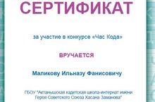 4-28 декабря 2014 года проводился Всероссийский конкурс "Час Кода". Из нашей школы в конкурсе принял участие учитель информатики и математики Маликов И.Ф.