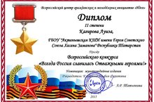 Ученица 10 класса Кагирова Луиза награждена Дипломом II степени Всероссийского конкурса "Всегда Россия славилась Отважными героями! " , а руководитель Курбанова А.Ф. награждена - Дипломом III cтепени. Поздравляем и желаем дальнейших успехов!