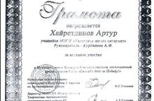 Грамотами участия награждаются ученики 10 класса Мингазова Регина и Хайретдинов Артур за активное участие в муниципальном конкурсе детского рисунка, посвященный празднованию 9 мая "Спасибо деду за Победу!"