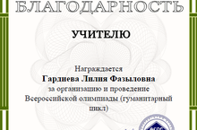 Учительница английского языка Гардиева Л.Ф. и МБОУ "Кадетская школа-интернат имени Героя Советскогот Союза Хасана Заманова"" награждены благодарностью за организацию и проведение Всероссийской олимпиады. Поздравляем и желаем дальнейших успехов!