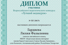 С 11 февраля по 20 марта на интернет-портале pedakademy.ru прошел Всероссийский педагогический конкурс "Лучший медиаурок", в которой учительница английского языка Гардиева Л.Ф. приняла участие и награждена дипломом участника. Поздравляем и желаем дальнейших успехов!