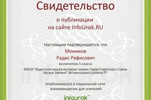 Опубликована методическая разработка воспитателя Мокимова Р.Р. в социальной сети взаимовыручки для учителей "InfoUrok.ru". Web-адрес публикации: infoUrok.ru/material.html?mid=68907. Поздравляем и желаем дальнейших успехов!