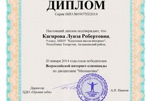 Ученица 9А класса Кагирова Луиза cтала победителем и награждена дипломом Всероссийской интернет-олимпиады по дисциплине "Математика"(Учитель математики Гумерова В.М.).