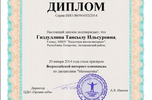 Ученица 9А класса Гиздуллина Тансылу cтала призёром и награждена дипломом Всероссийской интернет-олимпиады по дисциплине "Математика"(Учитель математики Гумерова В.М.).