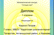 Поздравляем ученика 7 класса Петрова Кирилла (учитель математики Маликов И.Ф.), который занял I место в математическом конкурсе "Устный счет". Награжден Дипломом I степени. Желаем дальнейших успехов!