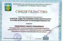 Учителю ОБЖ Фарухшину Дамиру Мирзануровичу было выдано свидетельство участника районного тура конкурса "Учитель года Республики Татарстан по курсу основы безопасности жизнедеятельности".