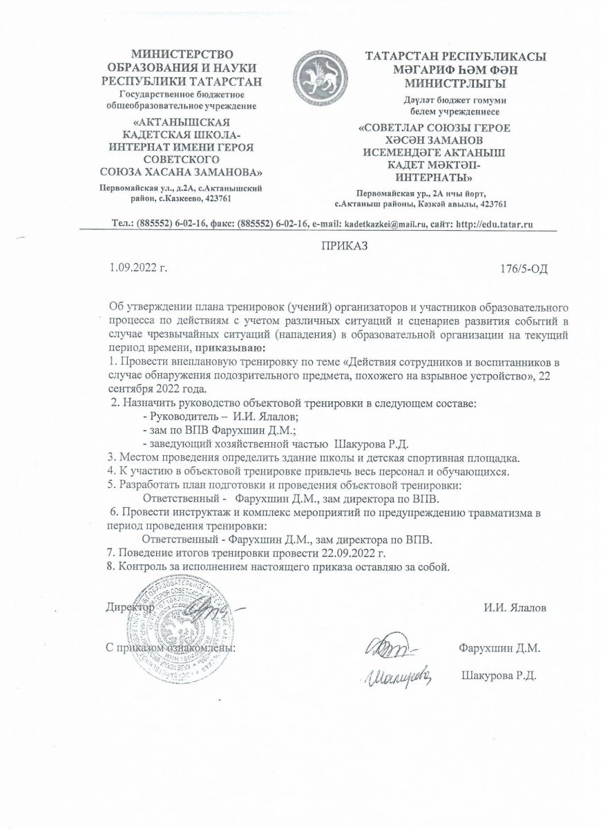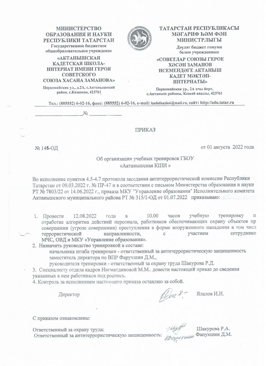 Приказ №146-ОД от 10.08.2022 г. об организации учебных тренировок ГБОУ "Актанышская КШИ"