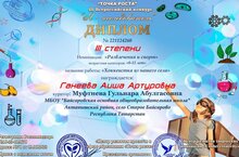"Үсеш ноктасы" үзәкләренең III Бөтенрәсәй "Я исследователь" бәйгесендә 3 класс укучысы Ганеева Гаишә Артур кызы III дәрәҗә диплом белән бүләкләнде. Укытучысы Мөфтиева Гөлнара Әбелгас кызы. Аларга киләчәктә дә зур уңышлар телибез!