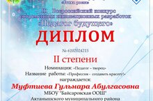 Автономной некоммерческой организацией Центр развития проектов в сфере образования «Точка Роста» проведен III всероссийский конкурс современных инновационных разработок «Педагог будущего» .Участвовавшая на этом конкурсе наша учительница Муфтиева Гульнара Абулгасовна победила в номинации:Педагог-творец, и получила диплом II cтепени. Учительницу Гульнару Абулгасовну поздравляем победой и желаем успехов!