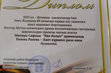 За роль соседки Хаят в драме Муниры Сафиной "Два облака", успешно выступившей на смотре драматических коллективов имени Мухтара Мутина в честь 80-летия Великой Победы и года защитника Отечества, учитель математики нашей школы Римма Разова была награждена дипломом. Поздравляем!