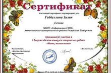 Мәктәбебездән Закирова Язилә, Габдуллина Зилия, Тимерова Гулнур, Нурлыгаянов Инзил, Салихов Фирзәр, Исмагилова Адилә “Мама, милая мама” дип исемләнгән I бөтенроссия иҗади эшләр конкрсында катнашып сертификат белән бүләкләнәләр. Аларга киләчәктә дә уңышлар теләп калабыз.