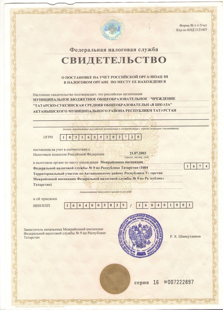 Свидетельство о постановке на учет в налоговом органе