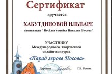 Татар Ямалы китапханәсе белән берлектә укучыбыз Нургалиев Руфил Николай Носов иҗатына багышланган конкурста 2 номинациядә, балалар бакчасыннан Нургалиев Румил, укучы кызларыбыз Илнара һәм Сөмбел фотография номинациясендә катнашып, сертификатка ия булдылар! Молодцы!