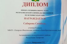 Укучыбыз Сабирова Сөмбел Татарстан тарихы фәне олимпиадасыннан призер булды! Укытучы: Файрушина Г.Г. Котлыйбыз!