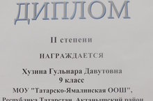 15 апрель көнне Казанда КФУ үткәргән татар теленнән төбәкара фән олимпиадасында катнашып җиңү яулаган укучыларны бүләкләү оештырылды. Анда безнең мәктәптән 9 класс укучысы Хуҗина Гөлнара катнашып II дәрәҗә диплом белән бүләкләнде.