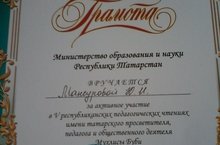 Грамота за активное участие 03.05.2017 21 апреля 2017 года учитель логопедии Ю.И.Мансурова награждена Грамотой Министерства образования и науки РТ за активное участие в V республиканских педагогических чтениях имени татарского просветителя Мухлисы Буби.