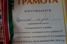 3 место в межрайонном турнире 03.05.2017 28 апреля 2017 года ученик 5 класса Такталачукской школы-интернат Нургалиев Айзат получил 3 место в межрайонном турнире Мензелинского района РТ по борьбе Корэш, посвященной 72 годовщине Великой Победы.