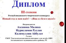 Учащиеся 5 класса Ахсанова Малика, Нурисламов Руслан, Калимуллин Айбулат стали призерами Республиканского конкурса "Новый год к нам идёт!" в номинации "Новогоднее оформление" и награждены Дипломам lll степени. Учащихся подготовила учитель Билалова С.С.