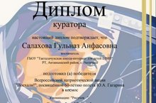 В рамках года Науки и технологий в РФ, Такталачукская школа-интернат проводит различные мероприятия, флешмоб, челлендж, конкурсы к 60 -летию полета Ю. Гагарина в Космос. Воспитатель Салахова Г.А. награждена дипломом за подготовку победителя акции "поехали" в номинации "Рисунок"